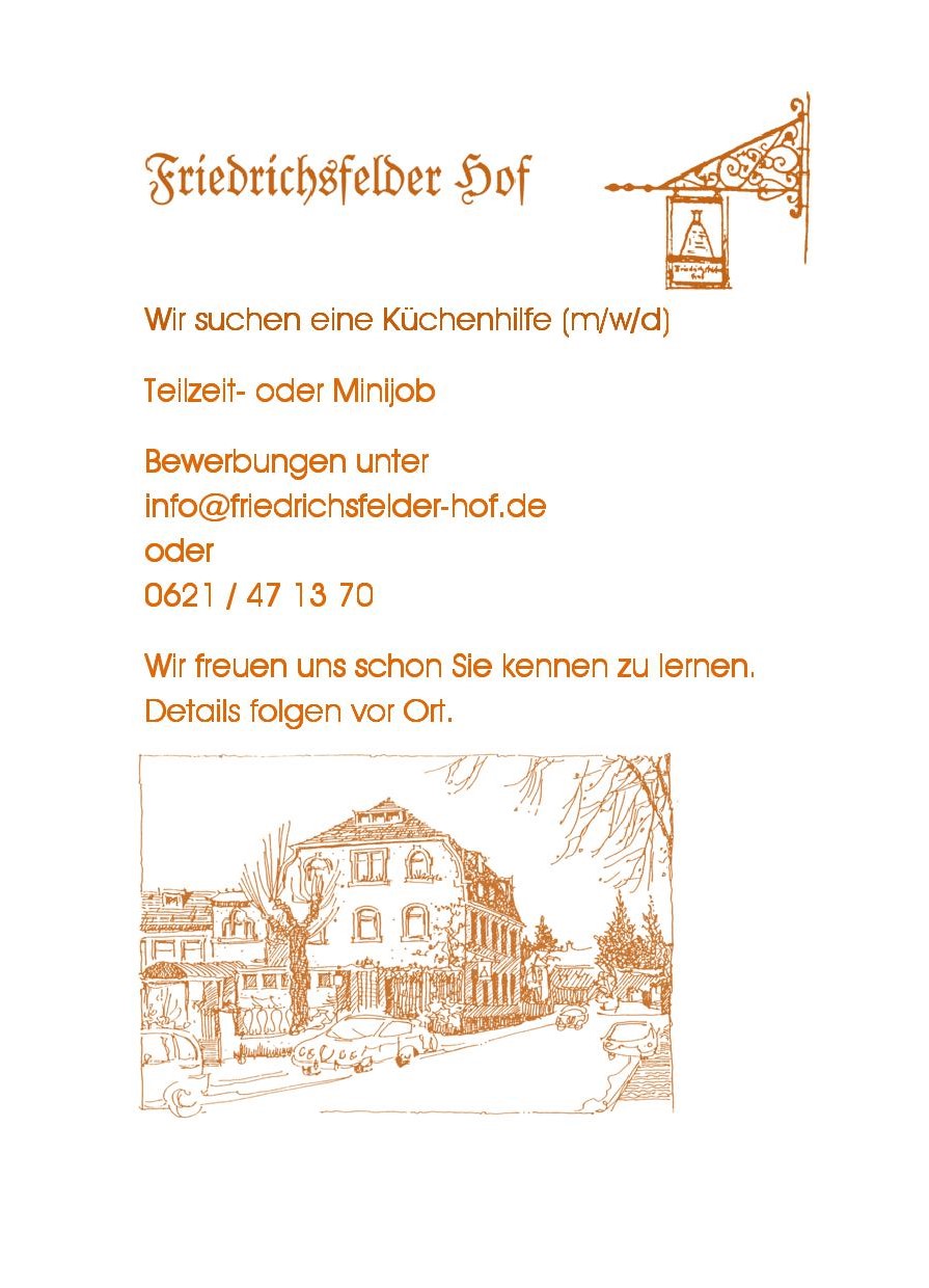 Wir freuen uns darauf, Sie bald im Friedrichsfelder Hof begrüßen zu dürfen. Bitte füllen Sie alle Angaben im Reservierungsformular vollständig aus. Reservierungen sind weiterhin auch telefonisch möglich. Unser Team setzt sich schnellstmöglich mit Ihnen in Verbindung und bestätigt Ihre Reservierung per E-Mail oder telefonisch. Bitte beachten Sie: Anfragen per E-Mail für den gleichen Tag können wir nicht berücksichtigen; diese müssen mindestens einen Tag im Voraus eingehen. Für Rückfragen stehen wir Ihnen gerne zur Verfügung, Danke und Gruß aus Mannheim.